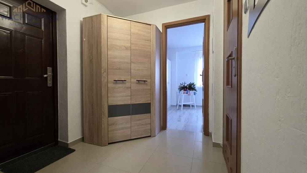 Przedpokój z pojemną szafę, zapewniający dobrą komunikację między pomieszczeniami.
