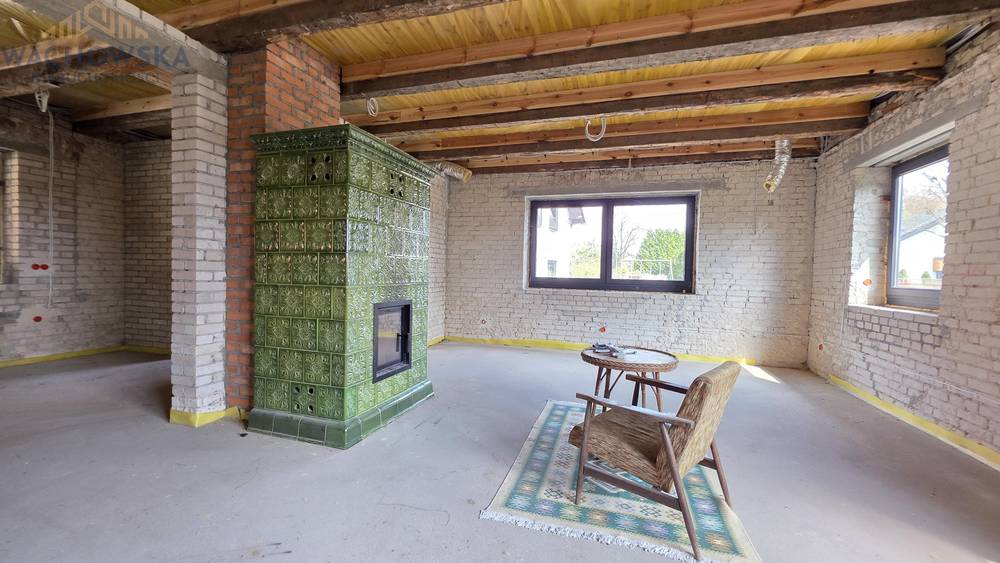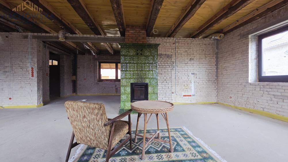 Parter (118,90 m): Zaplanowano tu przestronny salon z otwartą kuchnią, gabinet oraz dwie łazienki. Na całym poziomie wykonano nowe wylewki (posadzki) oraz zamontowano ogrzewanie podłogowe. W salonie znajduje się nowoczesny piec kaflowy z wkładem kominkowym (możliwość rozprowadzenia nadmuchów ciepłego powietrza na cały dom).